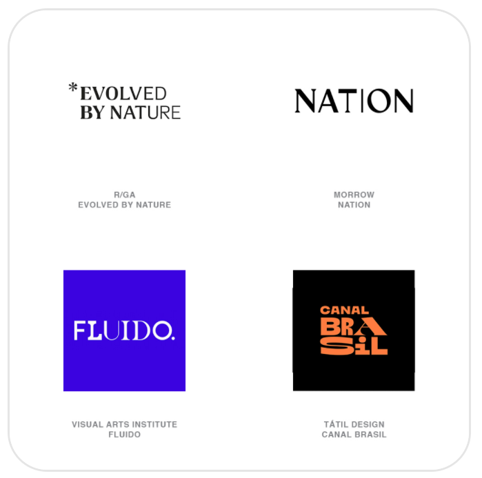 利用這個前提,設計師盡大努力通過創(chuàng)建文字標記來顯示可變字體的模擬演示,其中每個字母依次改變重量或其他屬性。Evolved By Nature 在他們的字標中直觀地指出了進化過程,但隨著每個字母從左到右開始蛻皮,直到后的苗條變形變得,這一點變得更加。甚 Evolved 的星號標志也經(jīng)歷了類似的過渡,但范圍更窄。這是一種在展示多樣性和變化方面大放異彩的技巧。Canal Brasil 采取了一種更加大膽和有趣的方式來應對這一趨勢,通過字母形式的循環(huán)動畫,每個字母形式都變形,就好像被浪費的復方湯劑藥水一樣。