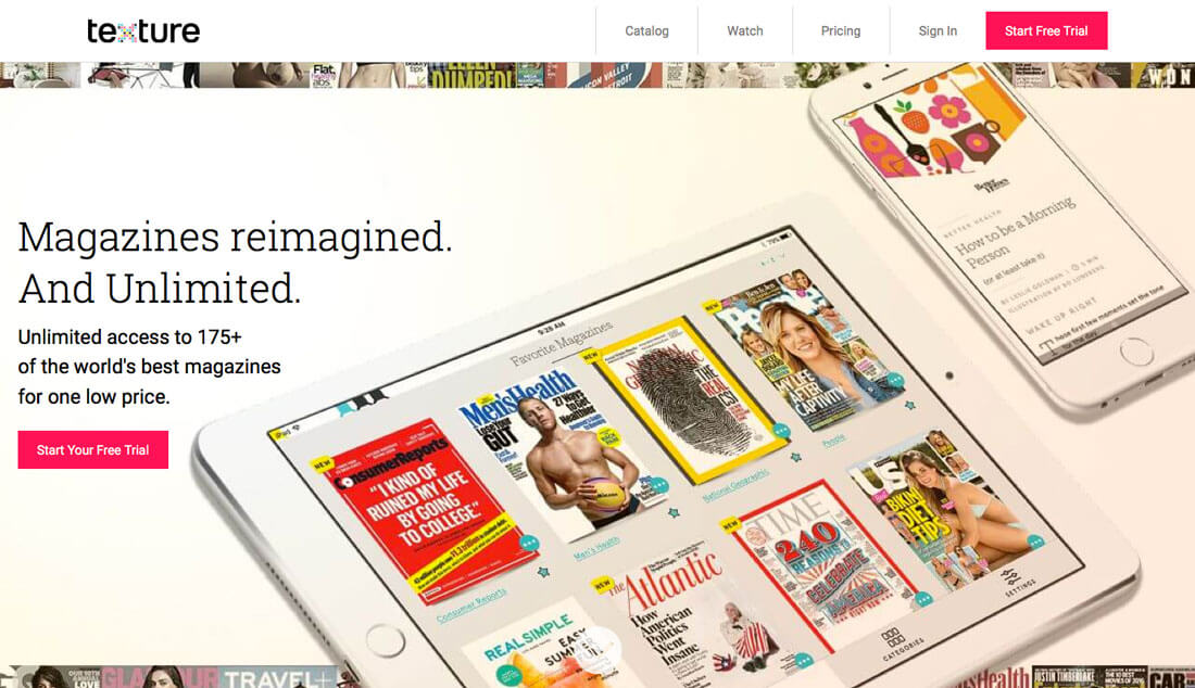 而其他的品牌也開始逐步回歸,開始在設(shè)計(jì)中融入漸變色彩。而在線電子雜志供應(yīng)商 Texture 干脆使用了全屏的漸變色彩設(shè)計(jì)。