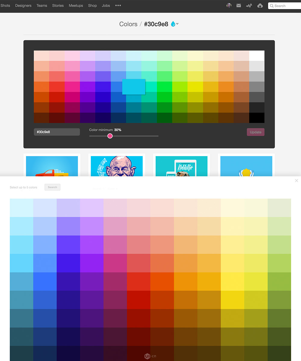 首先要打開Dribbble 和 Designspiration 點擊“color”鏈接,然后應(yīng)該是會出現(xiàn)這樣的頁面: