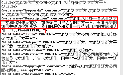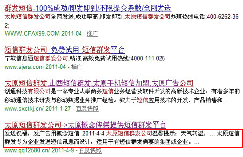 在這圖中說明,只有“短信群發(fā)介紹”這 里個(gè)文字是網(wǎng)站的主要概況。圖示“太原概念傳媒一直從事短信群 發(fā)和網(wǎng)站建設(shè)業(yè)務(wù),為您提供用戶認(rèn)可的群發(fā)平臺,有著先進(jìn)的短 信關(guān)鍵詞系統(tǒng),我們的服務(wù)和質(zhì)量一度得到用戶的贊成和認(rèn)可 ,電話13466811318。”這段描述是修改過的。如果我的觀點(diǎn)沒錯(cuò)的 話,下次快照就顯示這段話了。請關(guān)注!