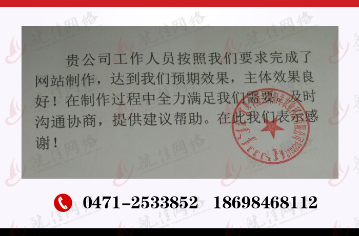 發(fā)布時(shí)間:2017-03-06關(guān)注:8414編輯:內(nèi)蒙古航佳網(wǎng)絡(luò)科技有限公司標(biāo)簽: 客戶評(píng)價(jià) 網(wǎng)站建設(shè)公司