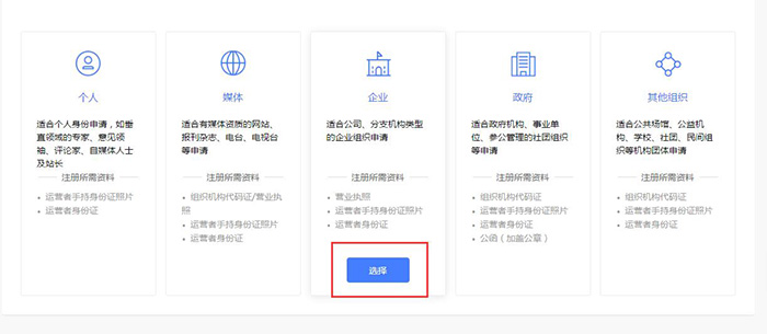 6、選擇熊掌號類型、如果你是給公司注冊熊掌號就現(xiàn)在企業(yè)類型、如果沒有公司營業(yè)執(zhí)照和對公賬戶的話,就只能注冊個(gè)人類型,選擇類型,點(diǎn)擊選擇按鈕,注意注冊類型以后不可以修改。如圖