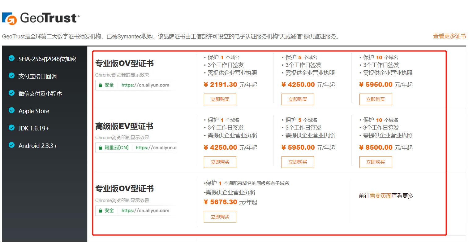 收費的https好多商家都提供,像阿里云、騰訊云都提供收費的https,大概費用是幾千的上萬的。下面給大家截圖看下。