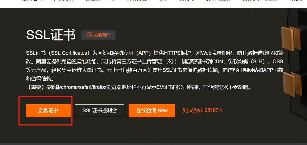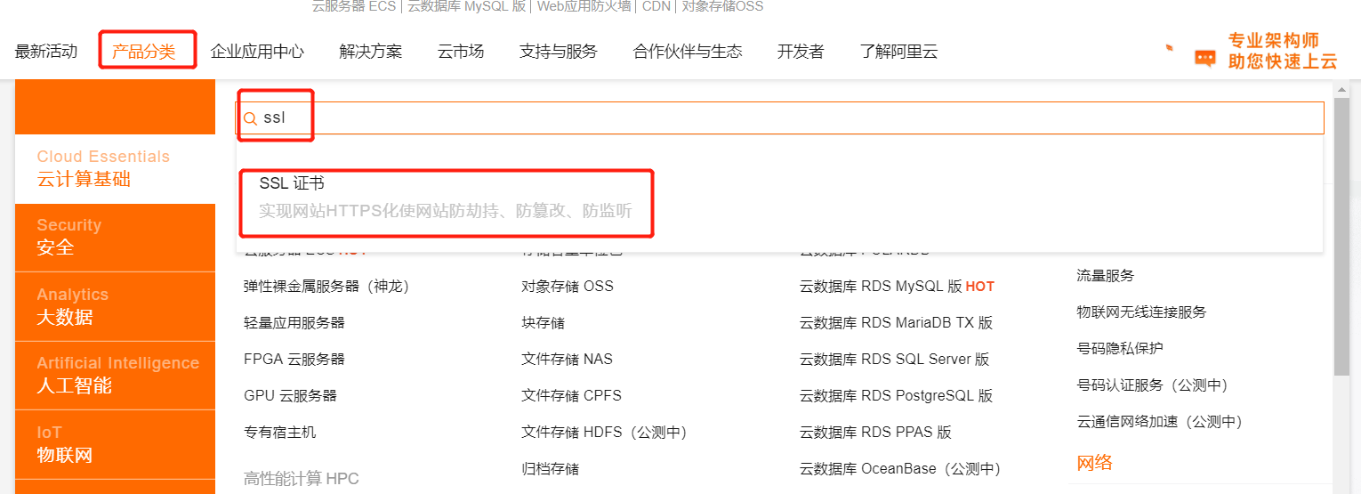 鼠標放到產(chǎn)品分類上,搜索云產(chǎn)品框里搜索ssl,選擇ssl證書選項。如圖。