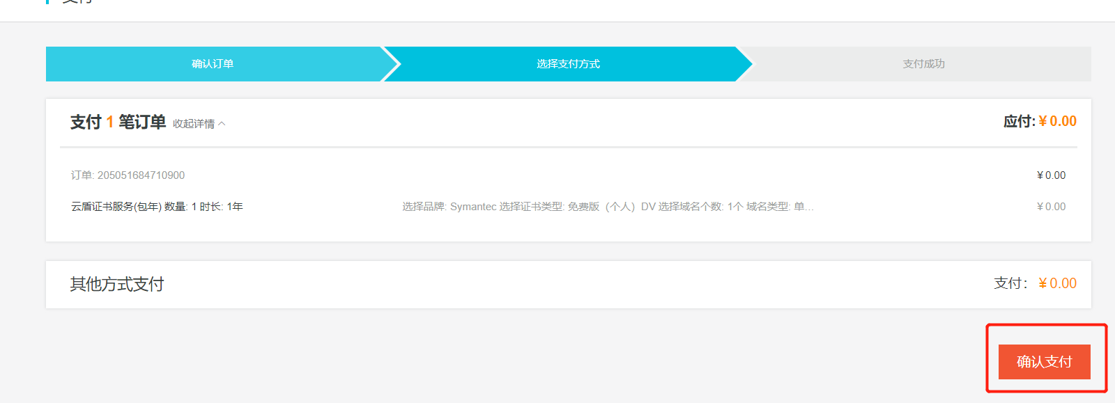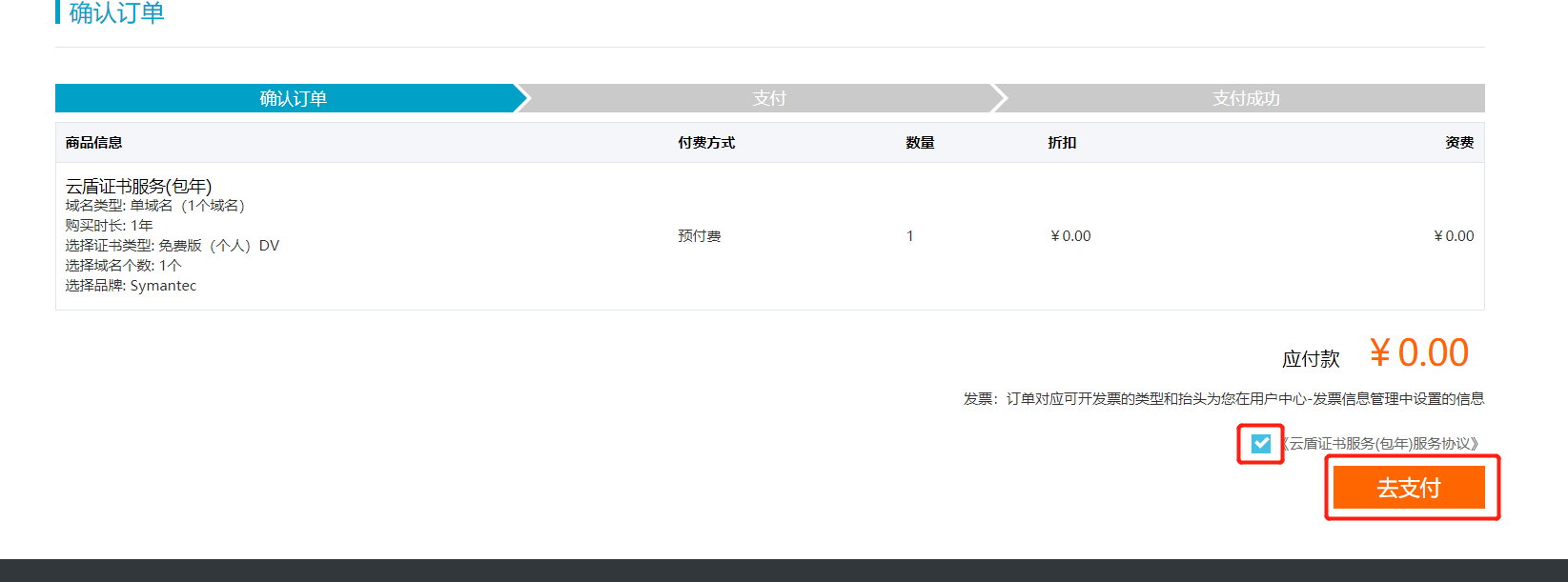 5、選中《云盾證書服務(包年)服務協(xié)議》,點擊去支付,如圖