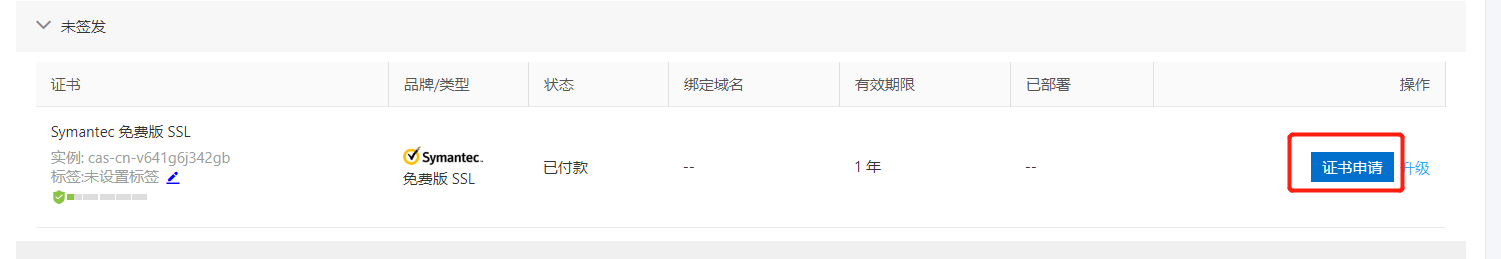 8、進入證書控制臺后臺,在未簽發(fā)的證書中,點擊證書申請,如圖: