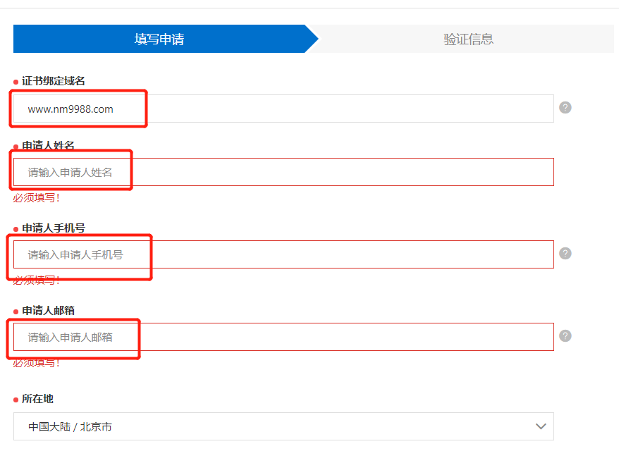 證書綁定域名填寫要申請https的域名,申請人姓名、手機號、郵箱,填寫上自己的信息就可以了。