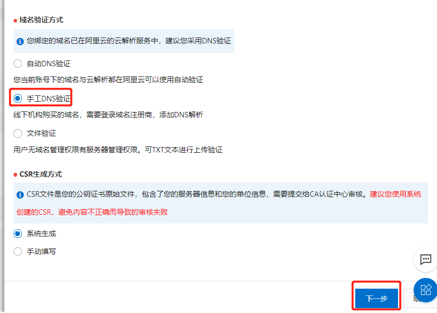 域名驗證方式選擇手工DNS驗證就可以了,點擊下一步