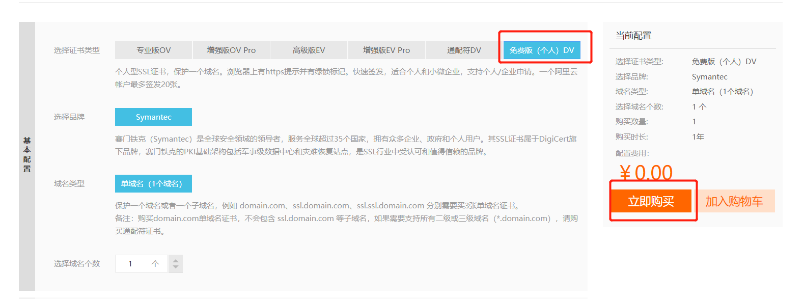 3、選擇免費版(個人)DV,點擊立即購買如圖。