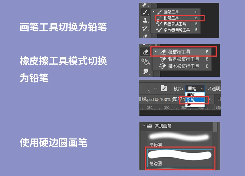 我們分別新建這幾個(gè)的大小的畫布,并將「筆刷」和「橡皮」的模式切換為「鉛筆」。