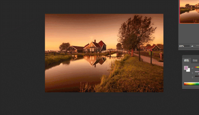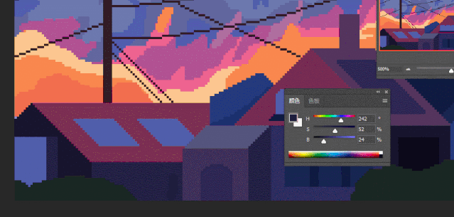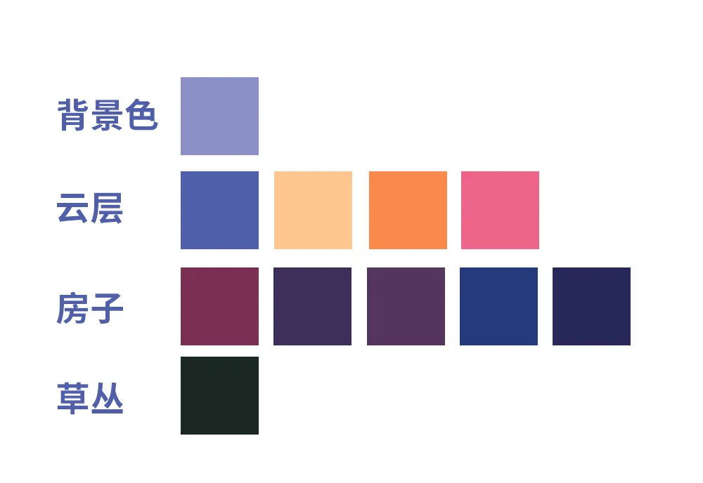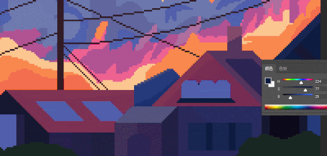 由于繪制的是一個(gè)晚霞的場(chǎng)景,所以在顏色的選擇上,使用的是紫色調(diào)。飽和度相對(duì)比較低,天空的明度較高,房子的明度較低。