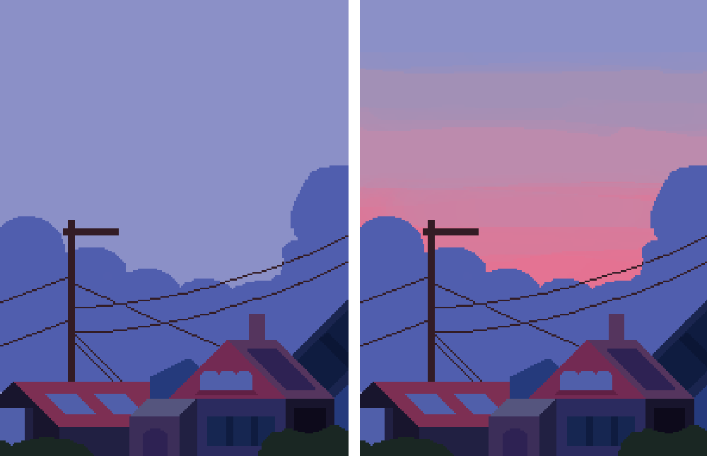 加入受晚霞影響的云層顏色,與云層同理,也可以分為明暗灰。