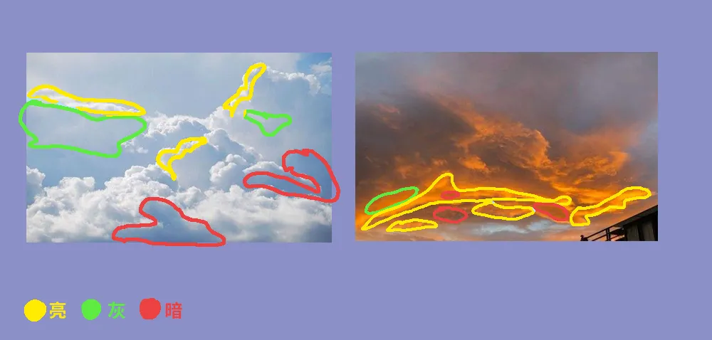 在開始畫之前我們可以來觀察一下真實(shí)云層的結(jié)構(gòu)??梢钥吹剑茖臃譃槊靼祷乙约笆芡硐加绊懙沫h(huán)境色。其中,亮部在外部,暗部分散在亮部中間,其余部分為灰部,形成云層的體積感。而晚霞,集中在云層的下方。