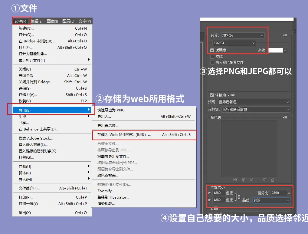「文件」— 「導(dǎo)出」—「存儲(chǔ)為web所用格式」。選擇JEPG和PNG都可以,如果你要導(dǎo)出的是透明通道就選擇PNG。輸入自己想要導(dǎo)出的圖片大小。這里一定要注意,品質(zhì)一定要選擇鄰近,不然導(dǎo)出的圖片會(huì)糊。