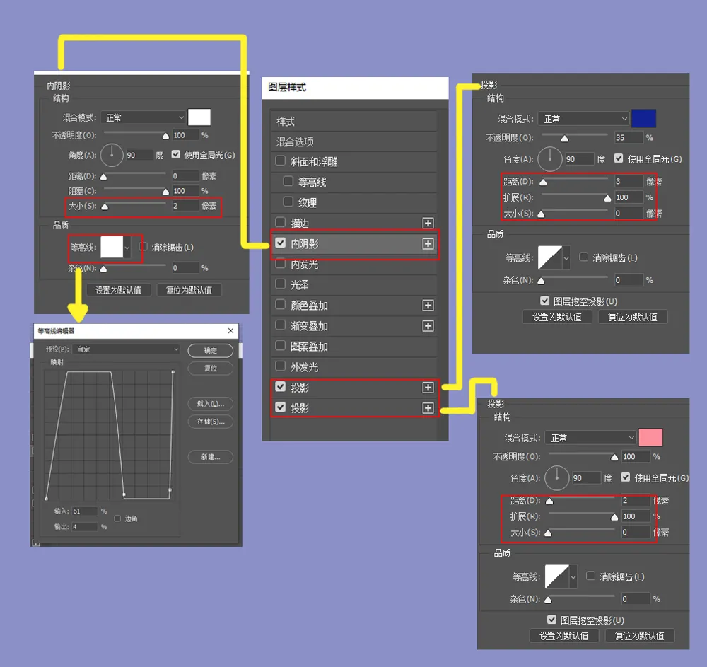 接下來設(shè)置圖層樣式,勾選一個(gè)內(nèi)陰影和兩個(gè)投影,設(shè)置參數(shù),并改變顏色。以下是數(shù)值參數(shù)。
