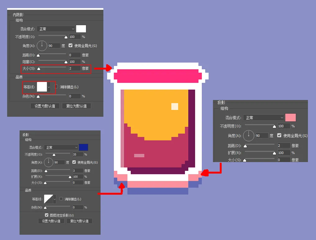 可以發(fā)現(xiàn)我們?cè)O(shè)置的內(nèi)內(nèi)陰影其實(shí)是白色的描邊,大小其實(shí)就是決定了描邊的粗細(xì),粉色的部分是個(gè)投影,距離是決定了描邊粗細(xì),后一層陰影是第二個(gè)投影,因?yàn)楦淖兞瞬煌该鞫龋灶伾诒尘吧嫌嘘幱暗母杏X。